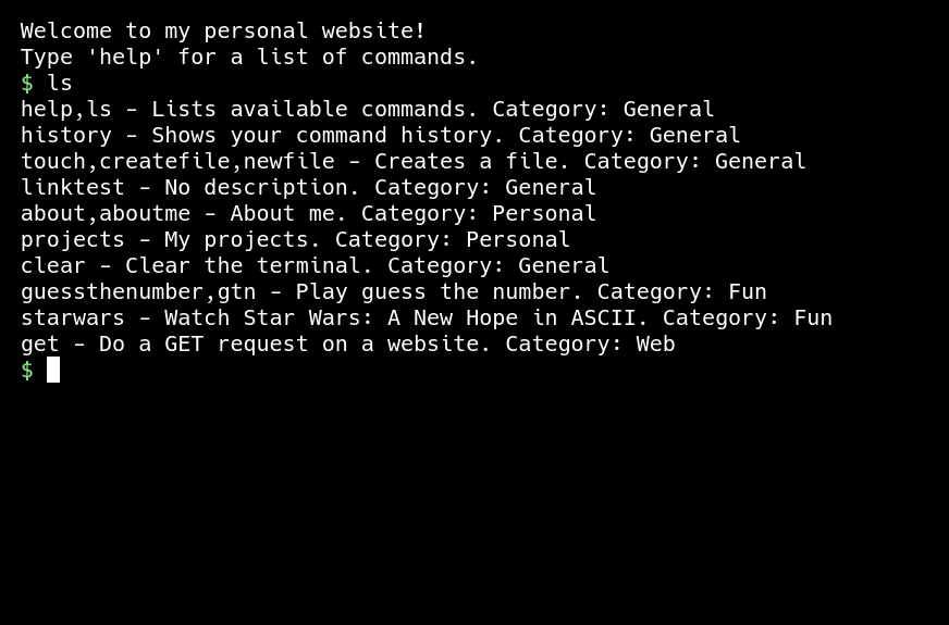 A terminal personal website! It has basic commands. Not very advanced